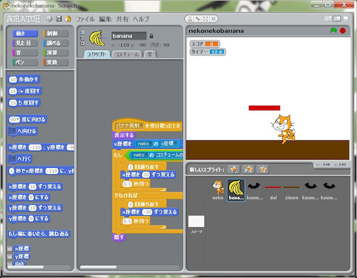 今回作ったのは、ブロック崩しの応用で、ネコがバナナを投げて敵を倒すというアクション風ゲームモドキです。